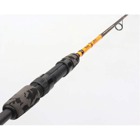 Featuring split hard EVA cammo pattern grips and blacked‑out reel seat and guides.