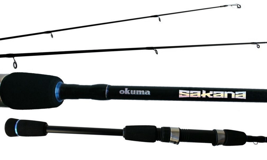 Okuma Sakana rods feature graphite composite rod blank construction, stainless steel hooded reel seat with Okuma logo, split grip butt design for reduced weight and improved balance.