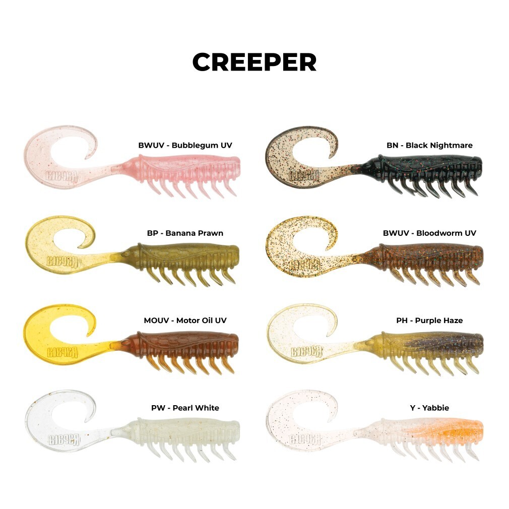 The Creeper is a curl tail grub with a difference - designed to work on the slowest retrieves and will flutter eductively on the drop.