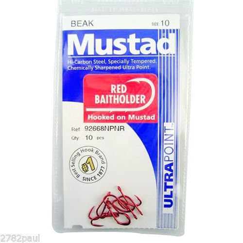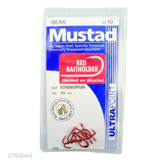 The Mustad Red Baitholder comes with a red finish for lower visibility underwater. The baitholder design, with two slices in the shank, is ideally suited to soft baits which can be hard to use with conventional hooks. The baitholder slices prevent the bait from falling down and bunching in the bend of the hook.