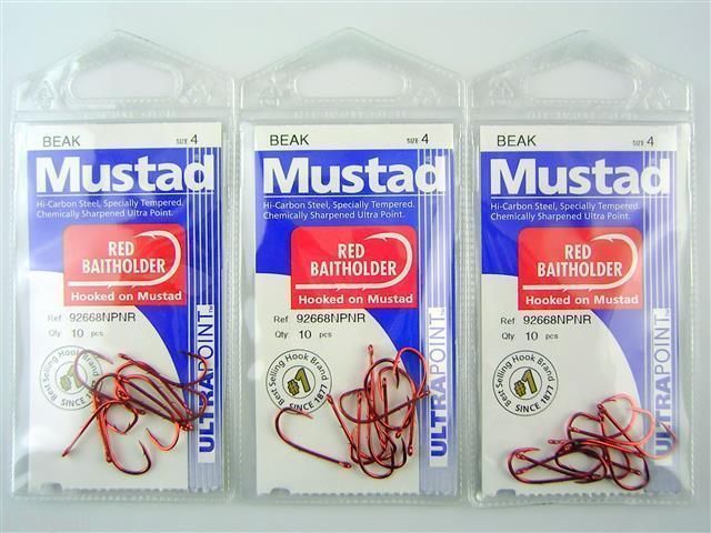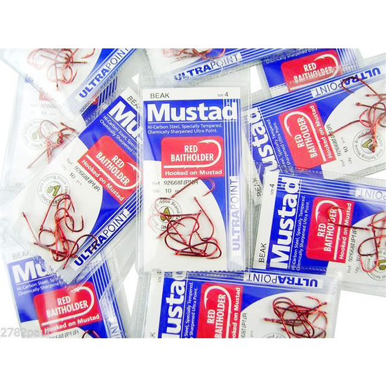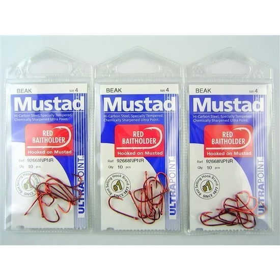 The Mustad Red Baitholder comes with a red finish for lower visibility underwater. The baitholder design, with two slices in the shank, is ideally suited to soft baits which can be hard to use with conventional hooks. The baitholder slices prevent the bait from falling down and bunching in the bend of the hook.