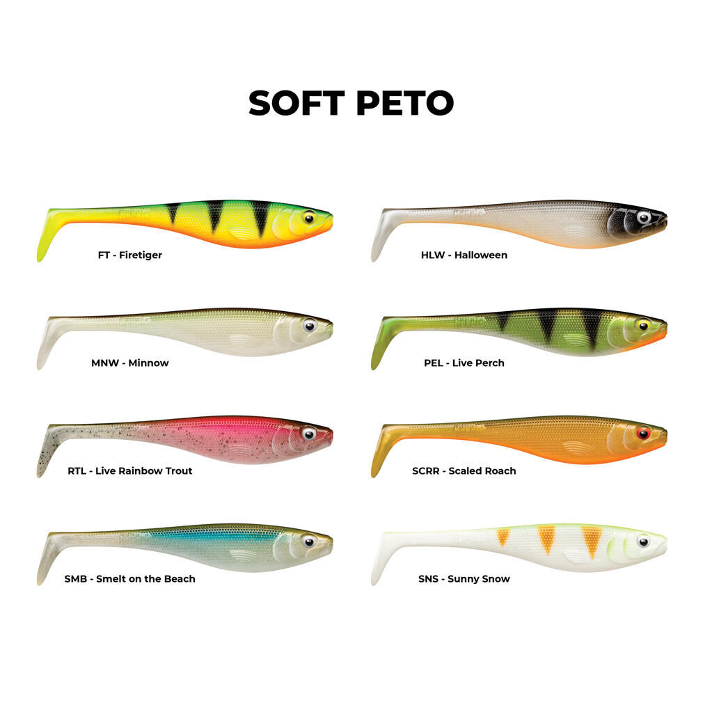 Thanks to the soft plastic construction, the Soft Peto’s textured body provides increased vibrations in the water. Finished with a three-dimensional scale pattern to give the bait a unique and life-like appearance